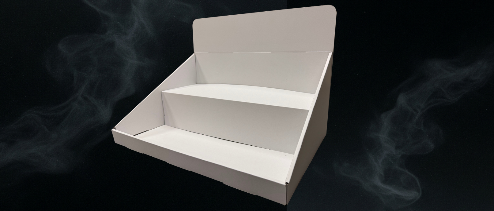 パッケージを美しく陳列できる段差式ディスプレイ什器です。